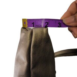 Just look at the Sheen of a silvery taupe champagne on this square shaped Medium Size Handbag with a cute Floral dangle Accent