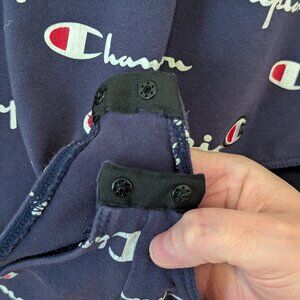 Women's Champion Everyday Tank Top Bodysuit. All over logo graphic print, navy blue with red and white in size L. When the fabric is stretched, the screen printed logos separates a little bit, but don't peel (see pictures). Some signs of wear. 90% cotton, 10% Spandex.