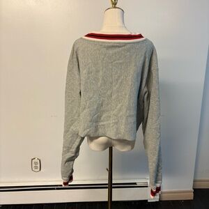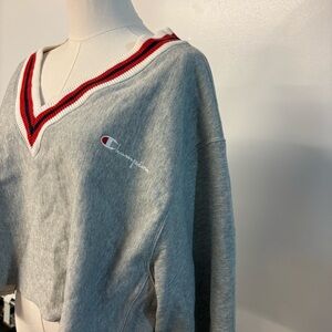 Champion Gray V-Neck Sweater with Red and White Accents Cropped