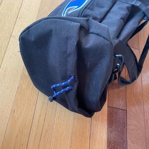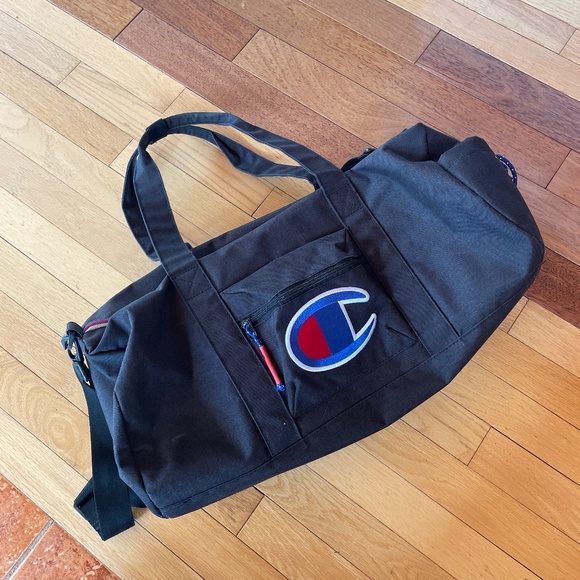 Gray bag. White, red and blue logo at the front. Red and blue zipper.