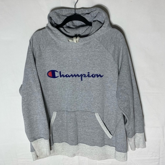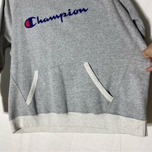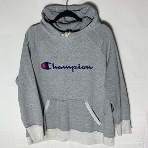 Soft heather gray hoodie with iconic Champion logo. Features a kangaroo pocket and hood.