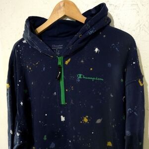 Stay stylish and comfortable with the Champion Men's Navy Hoodie. Featuring a unique splatter design, this hoodie is perfect for casual outings. The navy color adds a classic touch to your wardrobe.