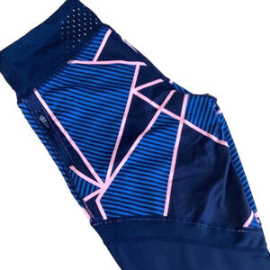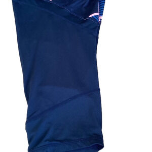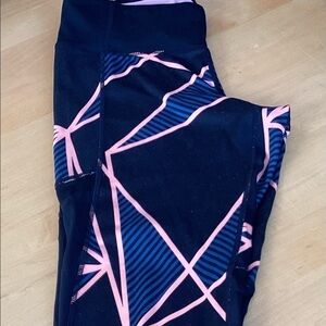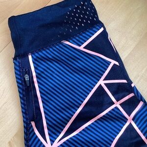 Pink & Blue comfy crop leggings in a fun pattern. Zippered side pockets and inside waist tie. In excellent used condition with no pilling.