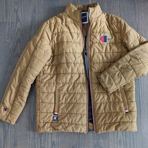 Really nice tan lightweight puffer jacket from Champion. It has a full zip, collar, pockets and an interior pocket as well.