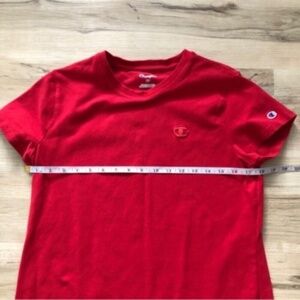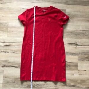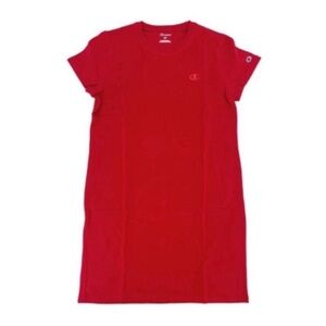 Bold scarlet t-shirt dress by Champion. Iconic logo on the sleeve.