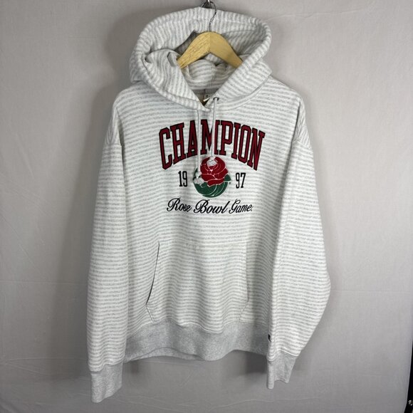 Champion Reverse Weave pullover hoodie celebrating the 1997 Rose Bowl Game with large embroidered rose graphic and bold “CHAMPION” lettering across the chest. Classic striped grey fleece body with kangaroo pocket and drawstring hood. Heavy Reverse Weave construction with expansion gussets for durability and shape retention. Official Champion product.