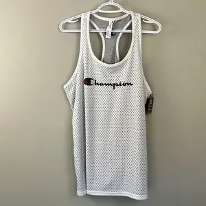 Women’s Champion Reversible Racerback Mesh Tank offers two looks in one. Double Dry Technology and wicking for moisture management is quick drying. Tank top can be worn on open hole mesh side or reverses to breathable lightweight Oxford Grey Jersey. Champion script graphic across center chest on mesh side and big C patch below neck on jersey side. Iconic "C" patch at left hip.