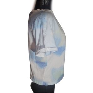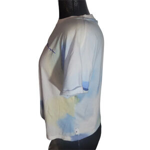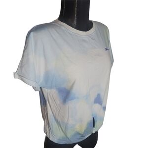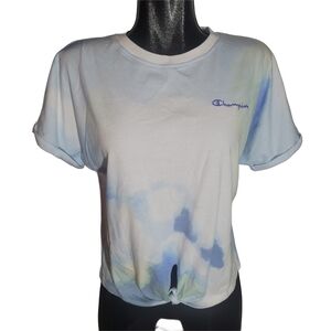 Embrace casual style with this Champion women's tie-dye t-shirt. Featuring a soft blue and white hue, this top offers comfort and a trendy look for everyday wear. Has folded cuffs and a fabric tie at front hemline.