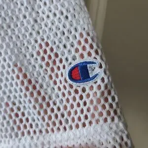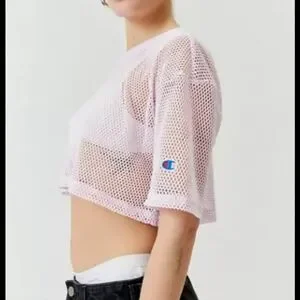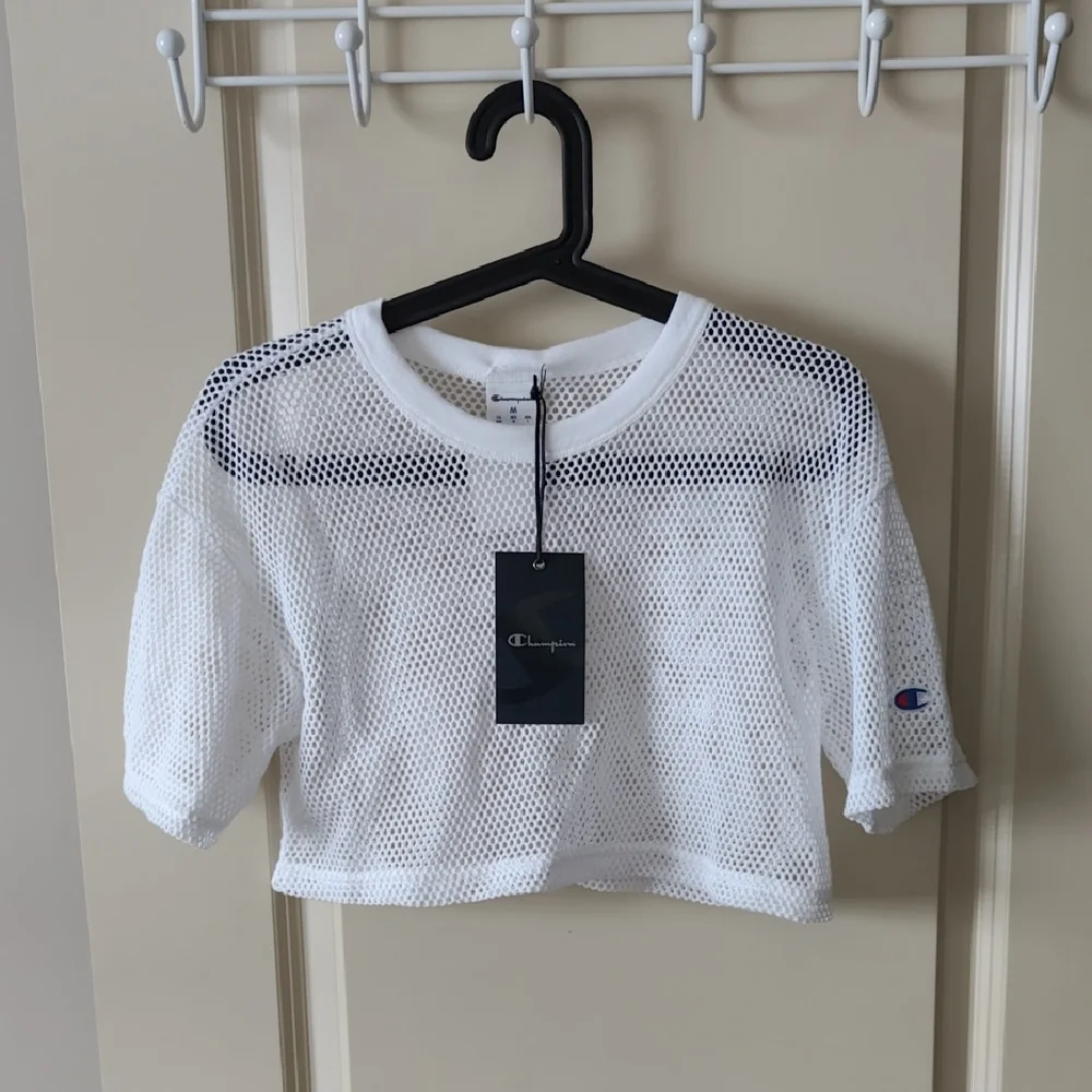Breathable white mesh crop top. Short sleeves and crew neckline. Champion tag and logo on sleeve. Sporty and stylish.