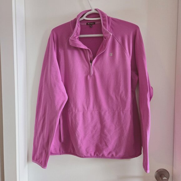Cozy up in this Champion performance pullover in a pink (first photo is the most accurate colour). Great for layering during workouts or daily wear. Features a soft fleece interior and a slight fitted cut with thumbholes and side pockets.