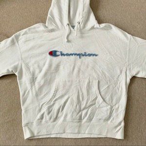 Champion reverse weave white hoodie women’s medium blue logo sweatshirt sport