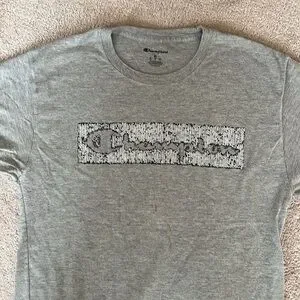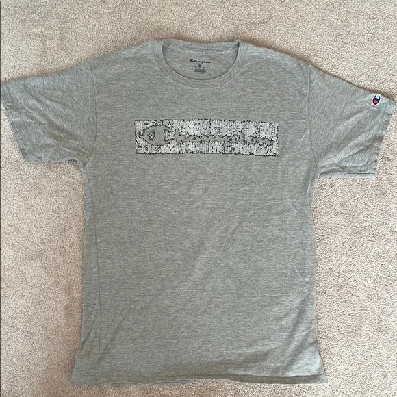 Champion t-shirt. Men’s size M. Light grey with the white/black logo pattern. Logo pattern is a ‘wear look’.