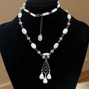 Chandelier Long Necklace with White Stones, Natural Magnesite & Milky Quartz