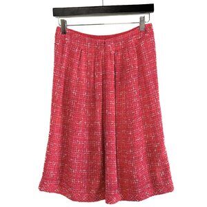 Chanel 06P Look 15 Red Tweed Skirt. Silk and cotton blend tweed. A-line silhouette. Below knee length. Zip and hook closure. Slit pockets at sides. Lined with silk fabric. Made in France.