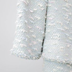 A dreamy pastel blue and pink tweed unstructured double breasted coat lined in dove grey silk from Chanel’s 2007 cruise collection, featuring subtle sequin embellishments, notched lapels, large cream enamel and silver-tone metal CC logo buttons, two large front flap pockets, and soft braided trim woven with iridescent threads. A stunning collector’s item.