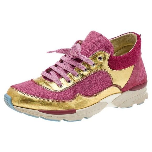 Chanel 14A Supermarket Fuschia Pink Gold Metallic Tweed Tennis Sneakers