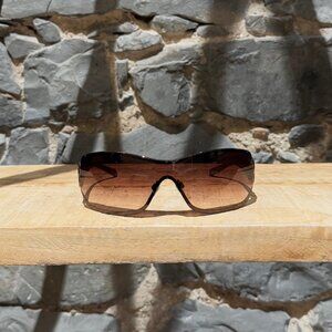 Shield-style design with wraparound brown gradient lenses. Glossy lilac grey branches. Chanel’s signature camellia flowers, embellished with pavé Swarovski crystals and CC logos at the center. Nose pads with CC logo. Subtle CHANEL engraved at bridge. Made in Italy. Come with Chanel case.
