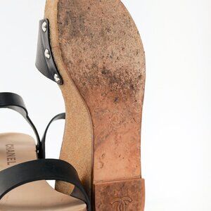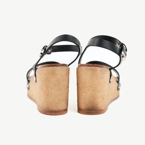 Made in Italy, these sandals from Chanel are crafted in a black leather on the upper, and feature rounded open toes, riveted detailing, an adjustable strap closure, and textured platform wedges.