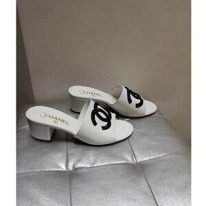 Chanel Black and White Calf Leather Sandals Sequin CC Logos Heel Block Classic