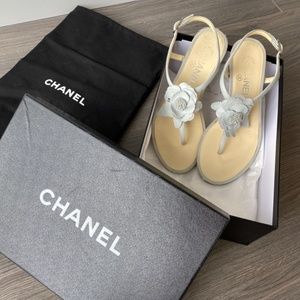 Chanel Blue Lambskin Camellia Flat Thong Sandals Size 36