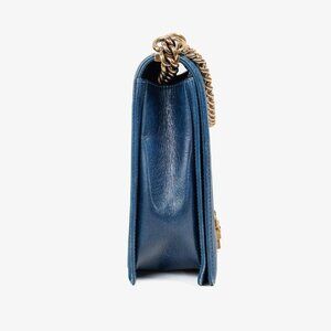 This Karl Lagerfeld-designed large Boy Bag in Blue is the embodiment of Coco Chanel's boyish charm, inspired by her love for Boy Capel. Made with quilted calfskin leather and bronze-toned hardware, it features a versatile chain-link strap with a leather pad and a prominent logo closure, while inside, it offers 1 zipper pocket and 2 dual slip pockets, as well as a key holder. A luxurious and functional statement piece.