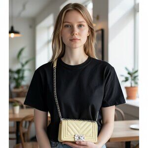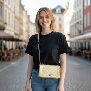 Beautiful small yellow pastel boy bag. Still new and condition. Only small lipstick stain inside and small dent mark outside.