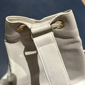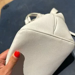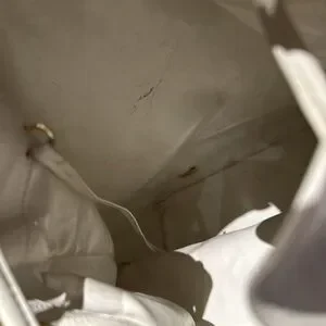 Vintage. This item is in good vintage condition. General wear, rubbing and cracking to white leather, hardware and interior wear.