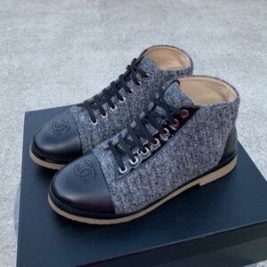 Authentic from the 2015 Collection by Karl Lagerfeld Crafted with a grey wool blend, the boots have leather cap toes carrying the CC stitch details and lace-ups at the front.