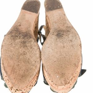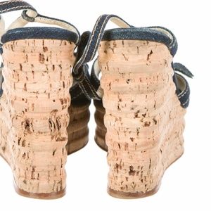 Denim Blue 100% Authentic wedges with Camelia accents at uppers,cork 4.2.5 “ heels. Excellent pre loved condition. Comes with original box and dust bag