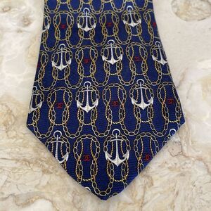 In beautiful preowned condition authentic Chanel 100% silk tie. Featuring a gorgeous pattern of chains & anchors with the CC logo monogram all over.
