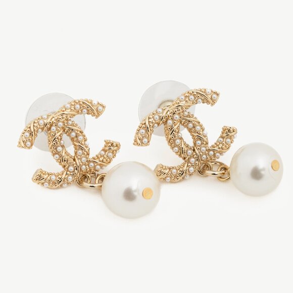 Chanel D22 Gold-Tone Pearl-Embellished CC Dangling-Charm Stud Earrings