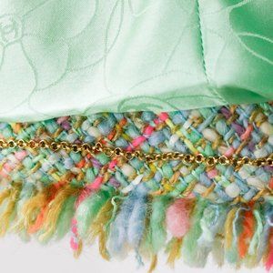 A vintage colourful tweed jacket from Chanel’s 2001 Fall Collection featuring two front pockets, frayed hems, and multicoloured ripped flower trips along the collar and cuffs. The inside is lined in mint green silk with a camellia pattern and a gold chain along the interior hem.