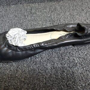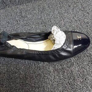 Elevate your wardrobe with these iconic Chanel ballet flats, a timeless addition for any fashion lover! Crafted from supple black leather with a glossy patent leather cap toe, these flats feature the signature gold-tone interlocking "CC" logo, showcasing Chanel's luxurious craftsmanship. The low-profile design offers all-day comfort, perfect for both casual and dressy occasions—pair them with jeans or a chic dress for effortless elegance.