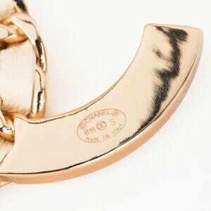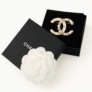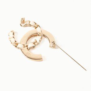 The large double-C logo highlighted by this Chanel Half Chain Woven Champagne CC Brooch features a stunning combination of gold-tone metal and champagne-tone woven chain, accented by rhinestones. Enhance any outfit with this elegant and timeless accessory.