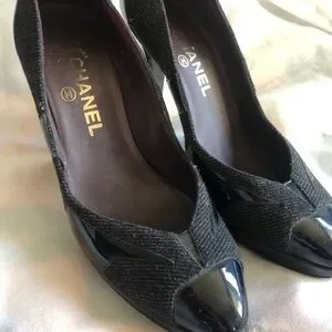 Chanel 4” heels in patent leather and tweed. Women’s size 8.5 Made in Italy.