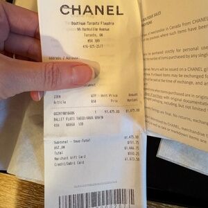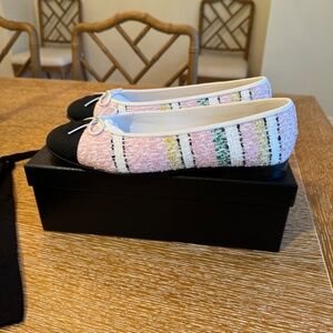 Only worn once! These were purchased at the Yorkville Chanel boutique in March 2024 - and they will ship with receipt if requested. Flats are a light pink and multicolour Iridescent Tweed, with a black grosgrain ‘CC’ cap toe.