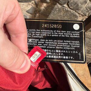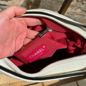 Quilted ivory lambskin leather and black smooth calfskin leather. Gold-tone, silver-tone and ruthenium finish metal chain-link shoulder strap. Adjustable shoulder strap. Top top closure with gold-tone CC logo at pull. Red fabric interior lining. Made in Italy. Comes with a dustbag and the authenticity card.