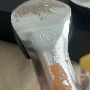 These were early 2000s from the lucite capsule Chanel footwear collection. They are really gorgeous. Silver leather lining and black lamb toe box. Fits true to size. I haven’t reached for these in ages so it’s time they find a new home. Easy to style and wear.
