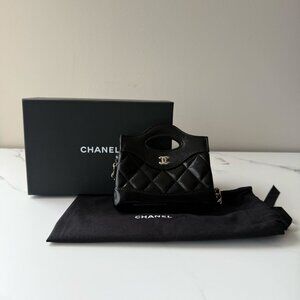 Classic Chanel Micro Clutch on Chain in black calfskin, gold hardware. This piece comes with box and dustbag
