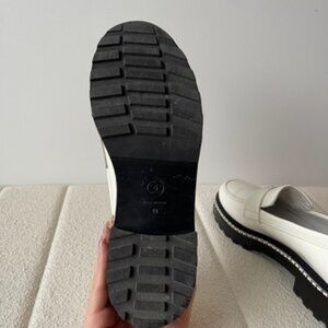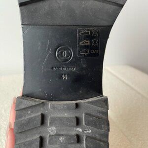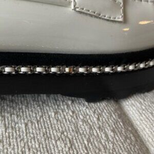 Authentic Chanel flats that gives any outfit an elegant boost. A minimalistic design that features metal monograms and a signature silver chain. Soles are made of black rubber and are fairly clean. Condition is good as the patent leather has small specks of dust that can be cleaned with a damp cloth. There is also a minor manufacturing defect on the chain of the right shoe (shown in 10th picture). Comes in slightly damaged Chanel shoebox. Please see pictures for more details.