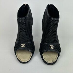 This is an authentic pair of CHANEL Mesh CC Peep Toe Ankle Boots in Black. These super-chic booties have a 4 inch leather wrapped heels, black mesh bodies with black leather trim, and zippers at the heels. These are excellent ankle boots, with a one-of-a-kind look, from Chanel!
