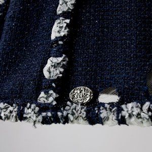 A collarless navy tweed jacket woven with black sparkle yarn and white frayed trim, featuring intentional holes lined with tulle mesh throughout and a front zipper closure.