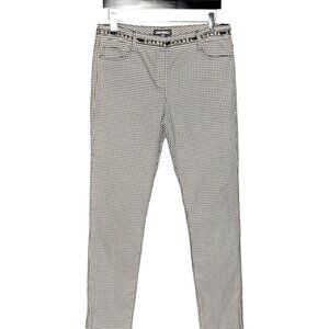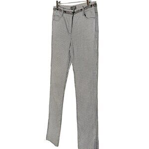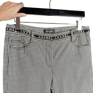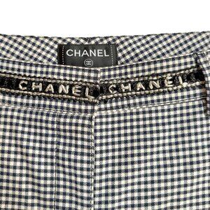 Mid-rise cropped trousers in stretch cotton gingham. Fitted slim-leg silhouette. Black and white Chanel logo braid trim along the waistband. Zip fly closure with hook-and-bar fastening. Two (2) front pockets and two (2) back patch pockets. Side ankle zip vents. Branded hardware. Made in Italy.