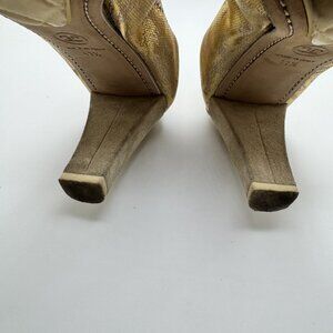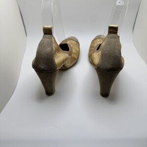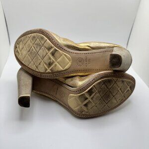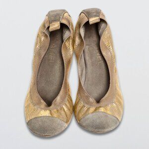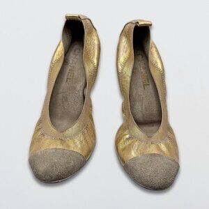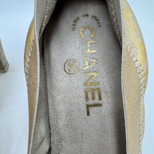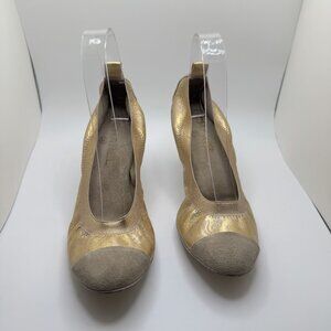 Chanel Scrunch Pumps Suede Cap Toe Leather Rubber Sole Slip-On Gold/Grey 41.5