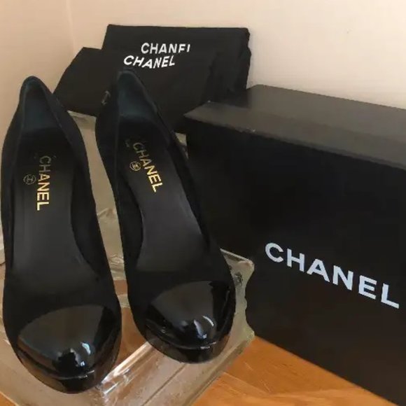 Chanel black suede w/ patent toe cap & stiletto heel platform pump (comes w/ box and shoe bags) – Size 9