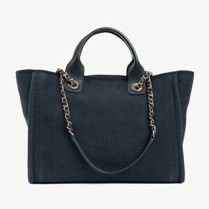 Made in Italy, this Deavuille shopping bag from Chanel is crafted in a Black canvas, and features tonal leather trim, gold-tone hardware, two top handles, two chained shoulder straps, and Chanel logo detailing on the front. The magnetic snap closure opens to a beige textile-lined interior containing two slip pockets, a zip pocket, and a removable zip pouch.