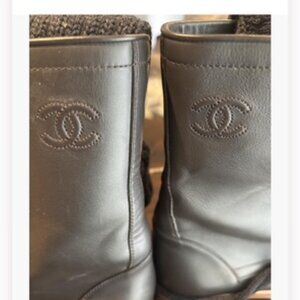 These Chanel CC Combat boots (soft brown) really make a statement for fall. These are genuine calfskin combat boots with lace up eyelets and beautiful detailing along the soles. These boots are in excellent condition; minimal creasing around back, and barely any creasing in the front area. The boots come with a sewn in soft grey wool sock. Note in image #5: there is one sock that has been ripped due to getting caught on an anklet when being put on, however, this is not visible when worn (it is on the inside and does not extend up to the top of the sock that sits nicely rolled on top). Authentication provided upon sale (I have a certificate from LegitGrails that can be provided upon sale).