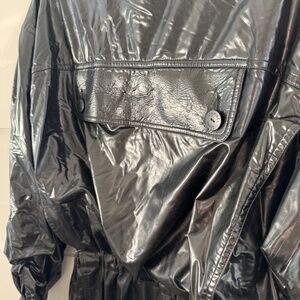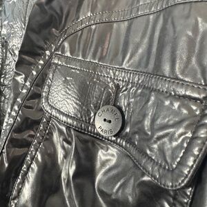 There is a flat pocket across the back with cc logo buttons, I believe the coat can be folded into itself in that pocket.