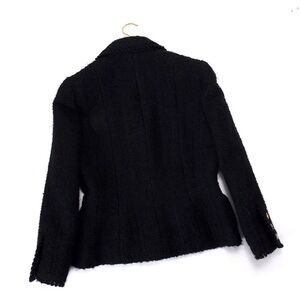 An iconic Chanel blazer in signature textured tweed, tailored for timeless elegance. With classic detailing and impeccable craftsmanship, it exudes Parisian sophistication. Lightly worn, it pairs well with jeans or a mini skirt for a casual look, or dressed up with tailored trousers or a silky black dress. The missing fabric tag doesn’t diminish its undeniable premium quality!