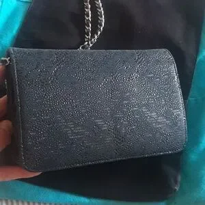 Excellent condition, barely used, 2014 Chanel wallet on chain. Navy fabric body with black leather embossed lace design. Embossed lace is calfskin. Very, very clean interior and exterior. Silver hardware still shines.